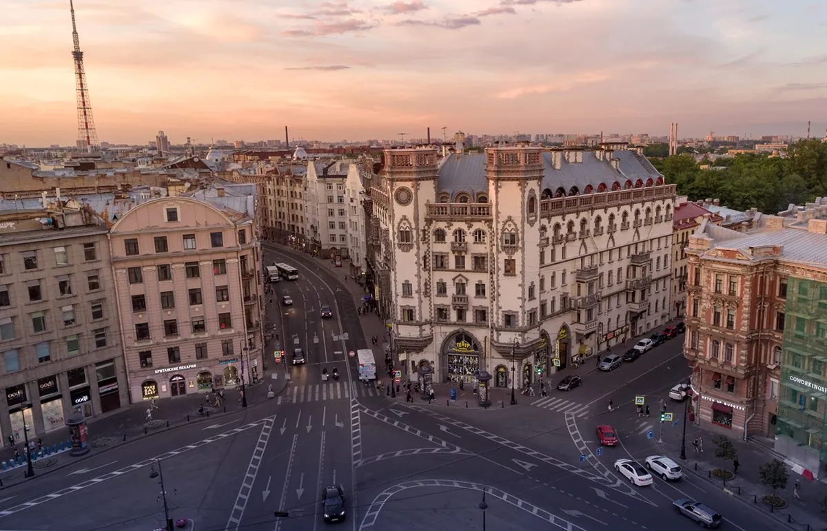 → Как идти дальше: Продолжайте к площади Льва Толстого. Через 10 минут увидите здание с двумя башнями, замыкающее перспективу Большого проспекта.